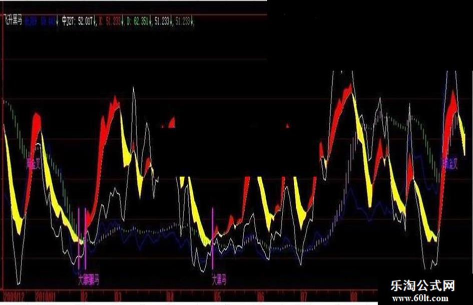 DRAWTEXT(CROSS(趋势线,0)AND 黑马线<40,-8,'大黑马');