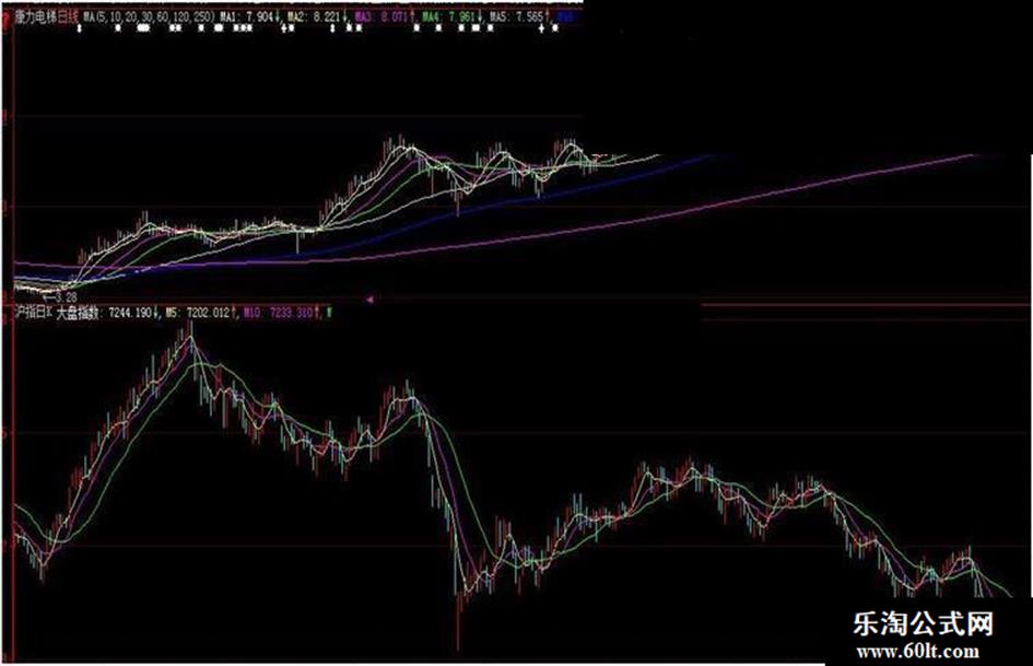 在个股K线界面副图中同步显示沪指日K线图。用于鉴定个股质量。大盘下跌,个股跌幅小于大盘下跌幅度或不跌;大盘盘整,个股爬升,强势尽显。