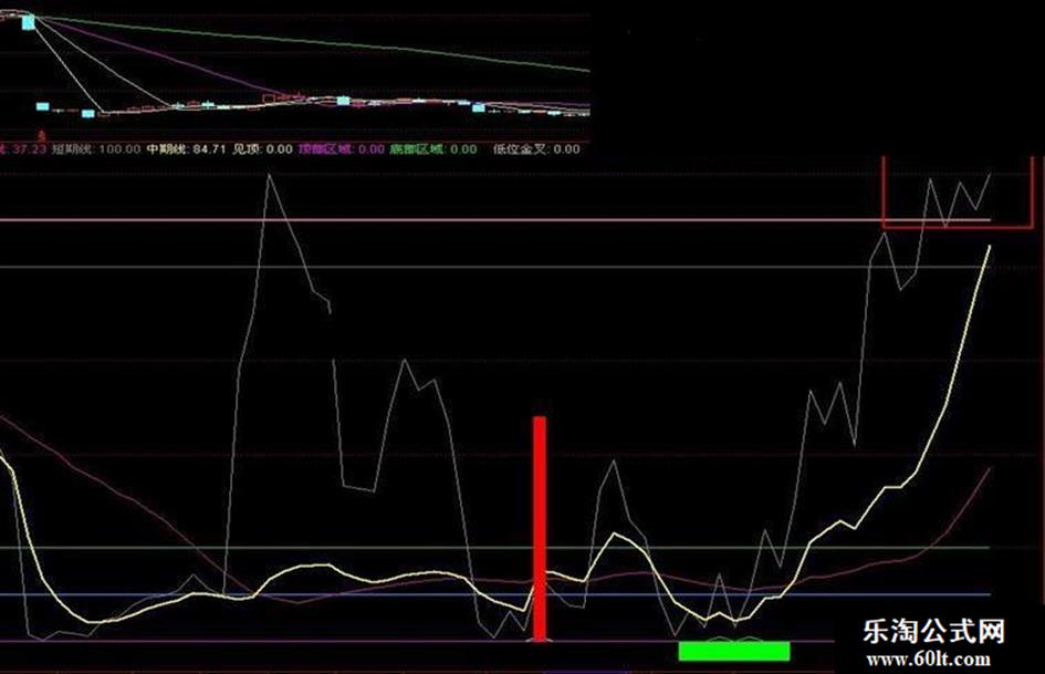 顶部区域:(中期线<REF(中期线,1) AND REF(中期线,1)>80) AND (REF(短期线,1)>95 OR REF(短期线,2)>95 ) AND 长期线>60 AND 短期线<83.5