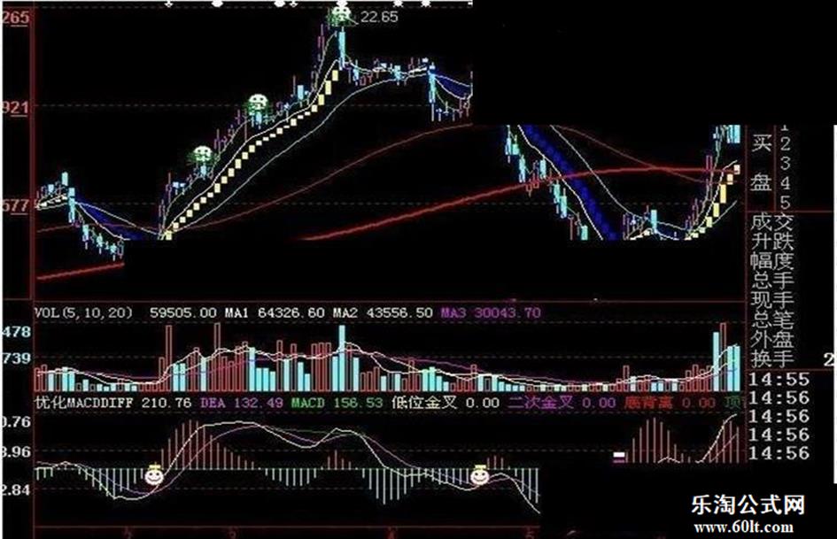 低位金叉:IF(CROSS(DIFF,DEA) AND DIFF<-0.1,0.3,0),COLORYELLOW,POINTDOT;