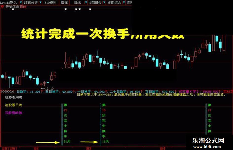 IF HSL>5 AND HSL<8 THEN BEGIN DRAWTEXT(c>0 and DISPSTATUS=2,100-(sss*i),' 日换手率在5%--8%, 大于7%,常常超过10%,属于股价成交带量,表明筹码在急剧换手。发生在低位或是通过第一阻力区,很可能是强庄积极进货。'),Color00FFFF,ALIGN2;