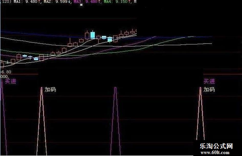 加码:if(CROSS(CLOSE,加码价) AND 加码价>REF(加码价,1),68,0),COLORYELLOW ;