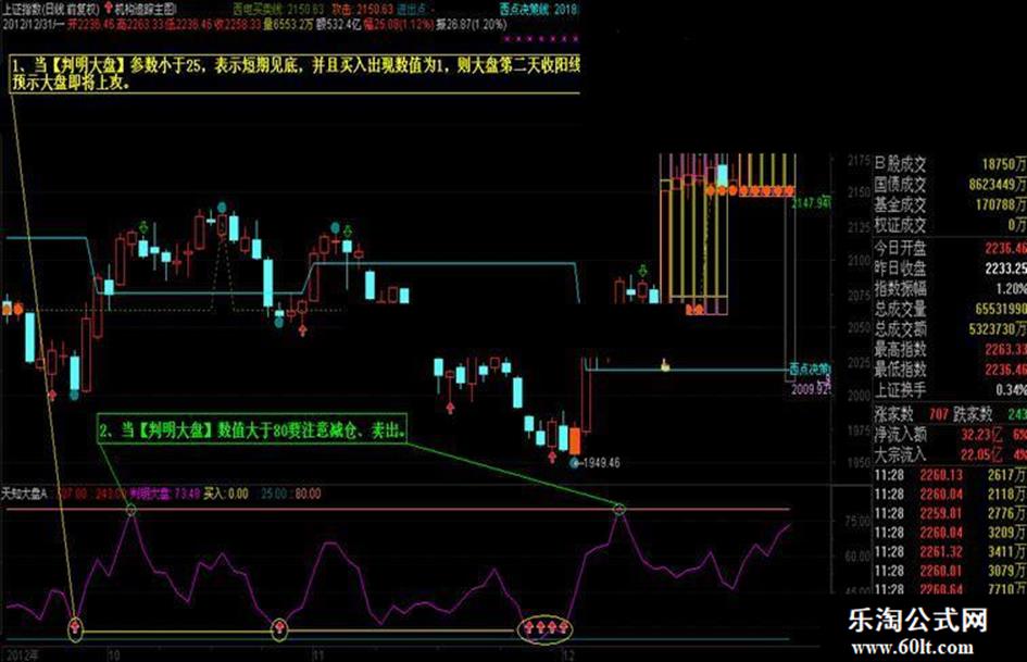 1、当【判明大盘】参数小于25,表示短期见底,并且买入出现数值为1,则大盘第二天收阳线的概率几乎100%,预示大盘即将上攻。