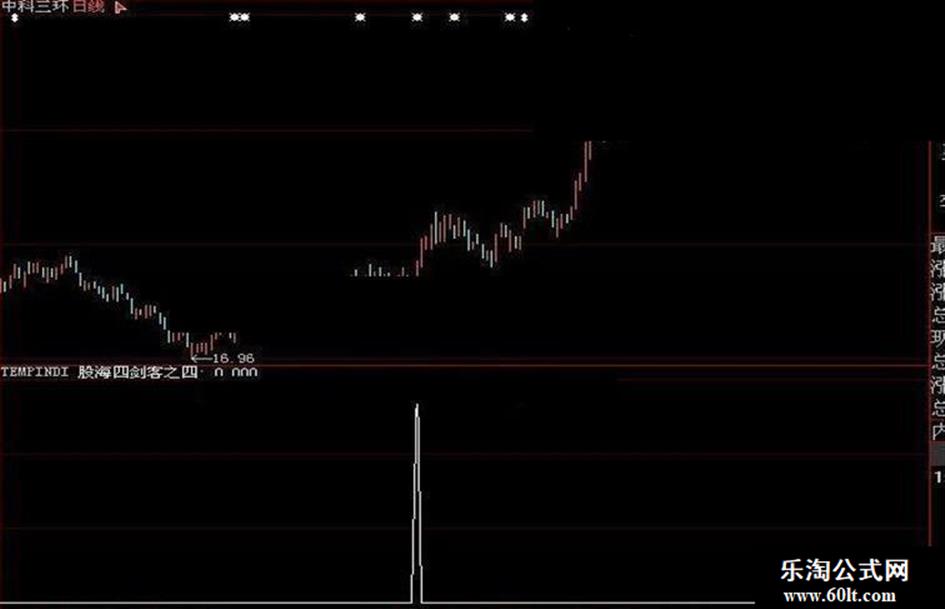 股海四剑客之四:CROSS(VAR2T,MA(VAR3T,6)) AND 宝塔线转阳信号 AND CR>REF(CR,1) AND 涨幅>7;