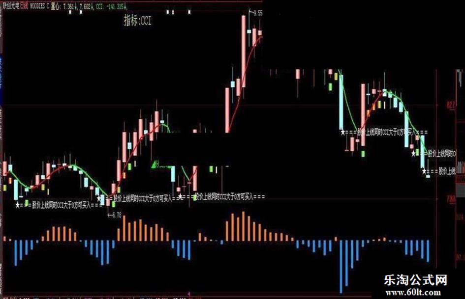 DRAWTEXT(CROSS(-100,CCI) AND CCI<REF(CCI,1),L,'★===股价上线同时CCI大于0方可买入==='),COLORWHITE;