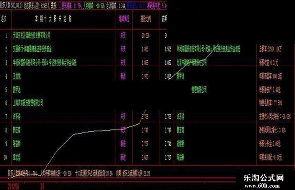 DRAWTEXTREL(5,35,'名次'),COLOR00FFFF;DRAWTEXTREL(120,35,'本 期 十 大 股 东 名 称'),COLOR00FFFF;DRAWTEXTREL(405,35,'增减情况'),COLORFF00FF;DRAWTEXTREL(478,35,'持股比例'),Color8080FF;DRAWTEXTREL(550,35,'前期比例'),colorwhite;DRAWTEXTREL(650,35, '前 期 十 大 股 东 名 称'),COLOR00FFFF;DRAWTEXTREL(880,35,'股票名称:'+'【'+STKLABEL+' '+STKNAME+'】'),COLOR00FFFF;