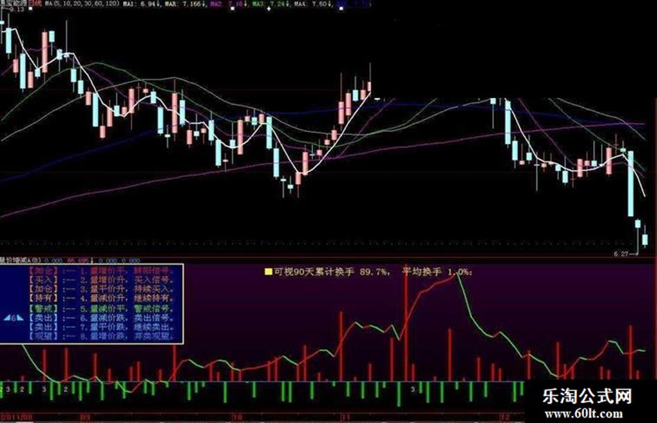 DRAWTEXTABS(0,110,' 【卖出】:-- 7.量平价跌,继续卖出。'),colorFFCC00,LINETHICK2,LAYER0;