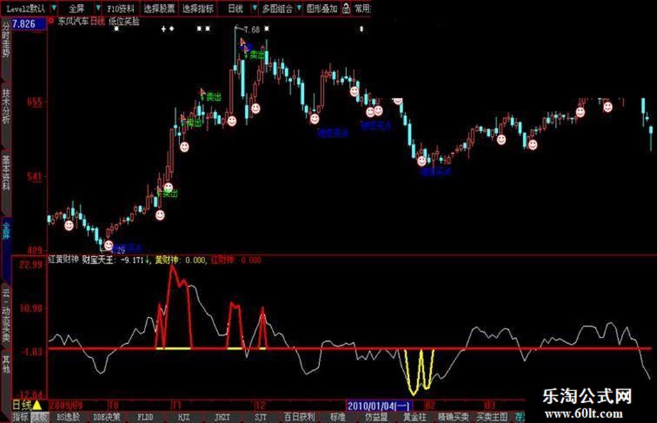红财神发卖出信号,财宝天王(白线)继续上升时,可继续持仓,向下转向时即刻卖出,应该是一段大跌的开始,