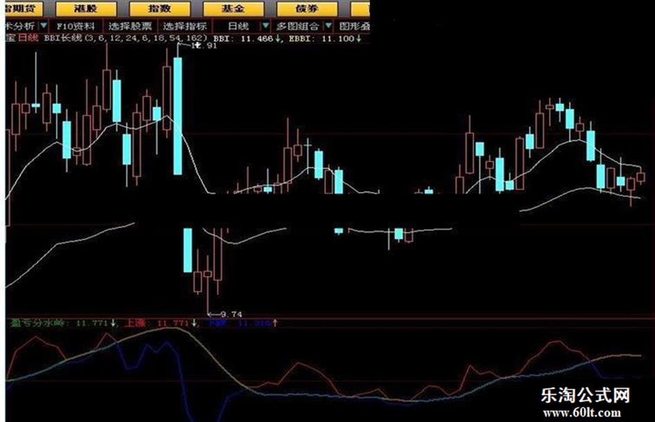 下跌:IF(A<盈亏分水岭,A,盈亏分水岭),colorblue;