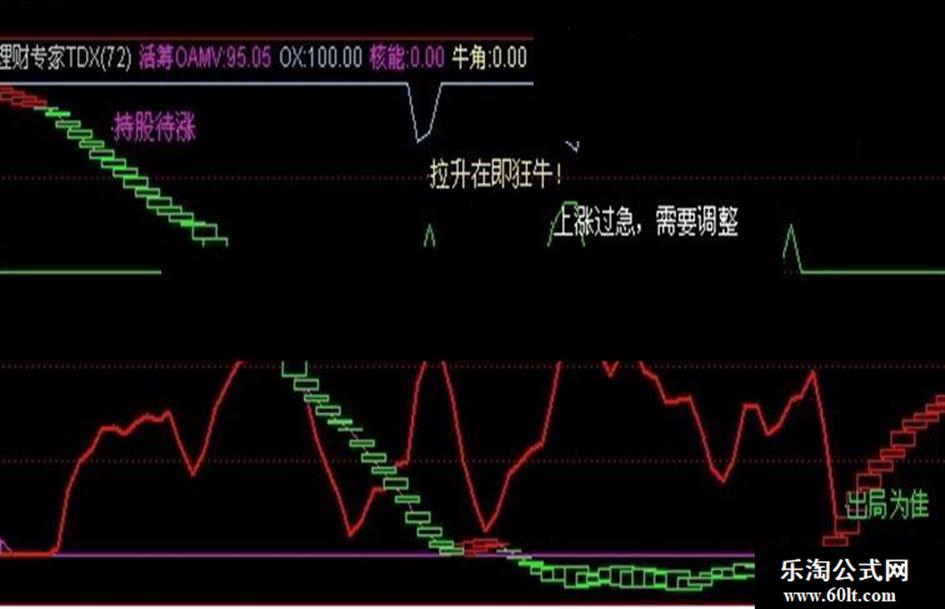 DRAWTEXT(VAR27 AND COUNT(VAR27,30)=1,90,'持股待涨'),COLORFF00FF;