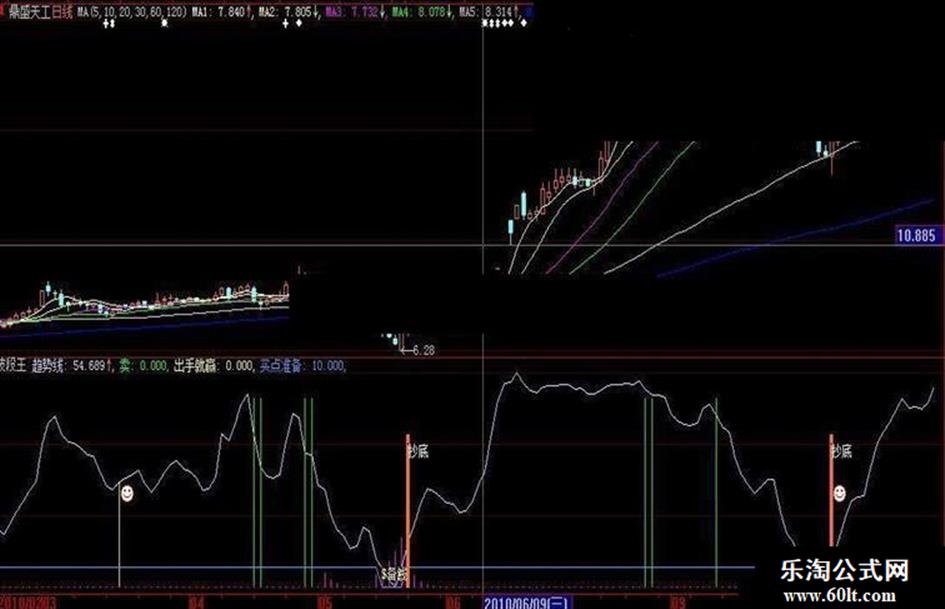 DRAWTEXT(IF(CROSS(趋势线,10),100,0),68,'抄底'),CoLorFFFFFF;