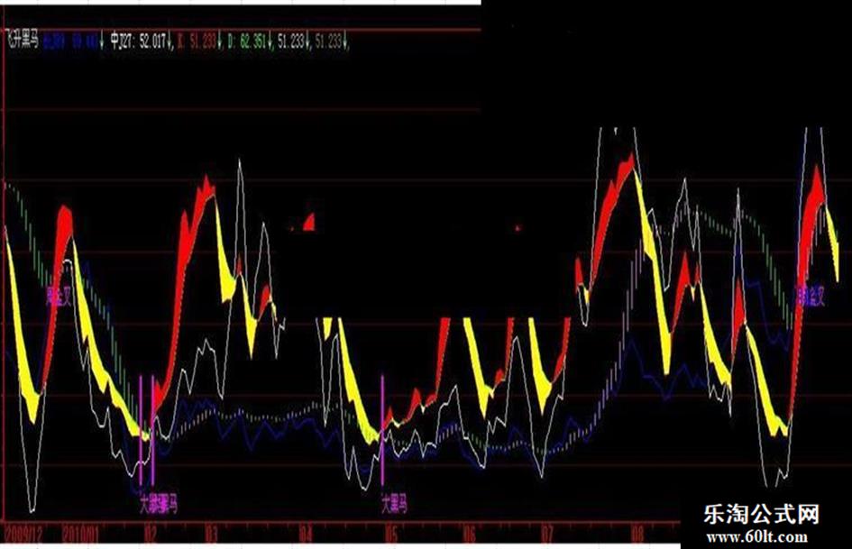 DRAWTEXT(CROSS(趋势线,0)AND 黑马线<40,-8,'大黑马');