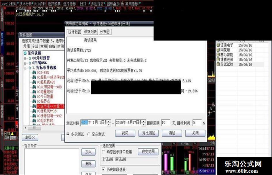 昨天大盘下跌选出了五个股票今天抓到两个股票涨停,两个大涨 说明:公式编写思路叫水落石出,大盘下跌他反而逆市上涨,这说明是有主力资金操作的股票,有主力护盘,主力资金没有出逃、货。要是没有主力资金操的股票他是要跟大盘一路下跌的。公式测试从2009年的3478点的高点到今天成功率是90%以上,从今年一月到现在是100% 公式要在大盘下跌这天才选得出股票