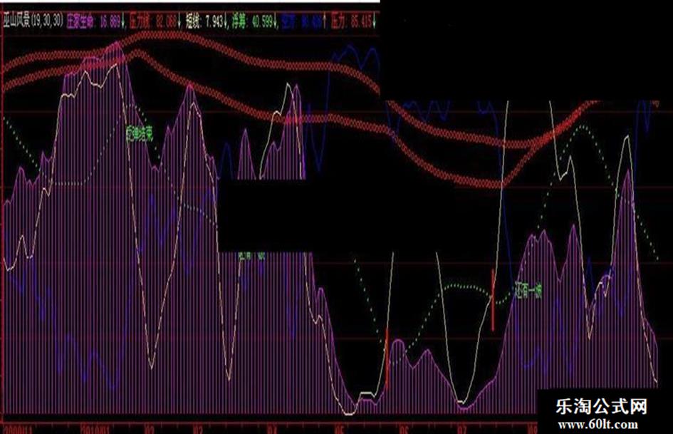 压力线: EMA(((HHV(AA,n2)+LLV(AA,n2))/2)/1,N1)+30,CIRCLEDOT,COLORRED;