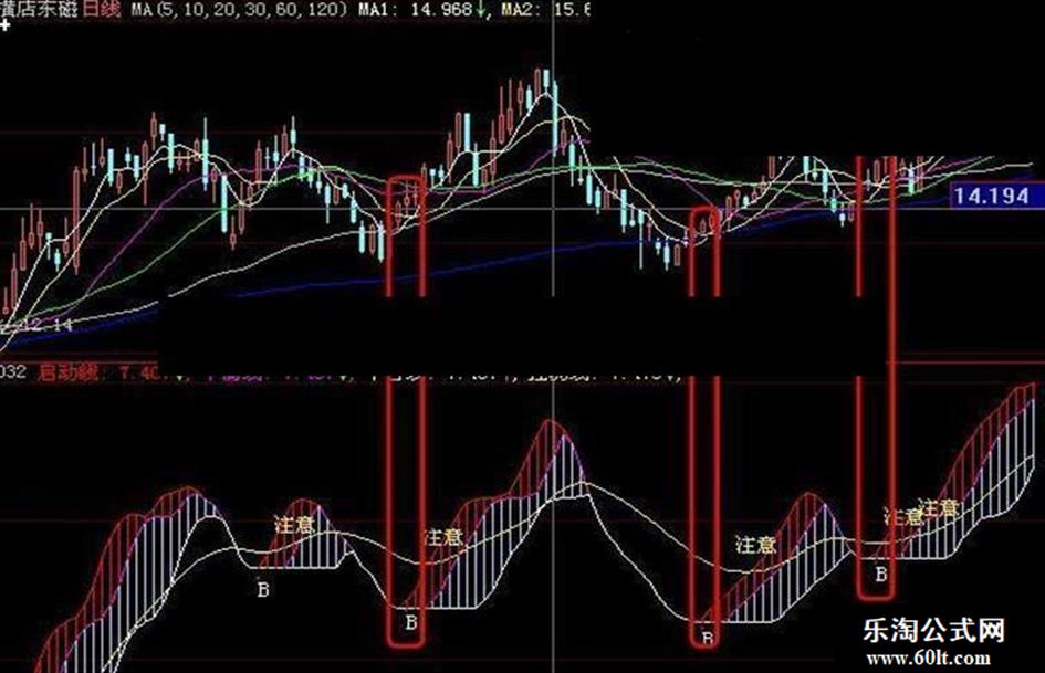 启动线:SUM(EMA((C+L)/2,2),5)/10.158,COLORRED;