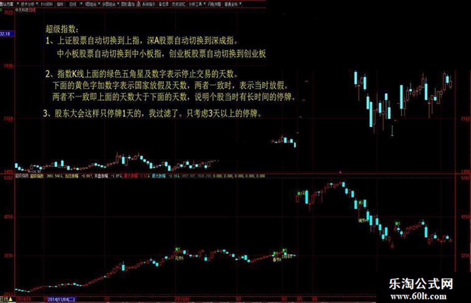 2、超级指数用在个股副图上,呈现K线形态。超级指数K线上面的绿色五角星加数字,表示当时停止交易的天数(未必停牌)。下面的黄色文字加数字表示国家放假和放假天数。当上面的数字和下面的数字一样时,表示国家放假,股市停止交易。当上面的天数大于下面的天数时,或只有上面天数时,表示个股当时停牌,停牌天数即绿色数字。