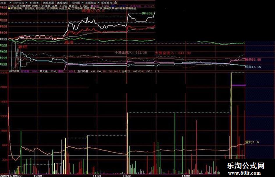 这是一个自已较为满意的分时量指标,主要是在分时量中增加了仿飞狐量比线,分时量叠加量比能更直观看盘,为了使用更爽些,在表现手法上故意地扩展(4倍),量的冲击次数以两种方式计数,更好地表现出主力意愿,图中黄色线柱是上攻冲击量,红色主动买.绿主动卖.原码献出.希望有人整理优化得更好