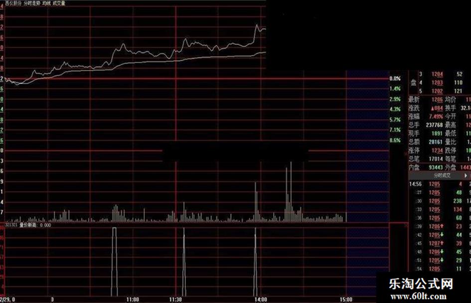 1、 分时图走势攻击性强,上涨则快速拉高,同时成交量放大,在推高过程中,一般呈现加速上攻的形态,而不能是拱形上涨。如图: