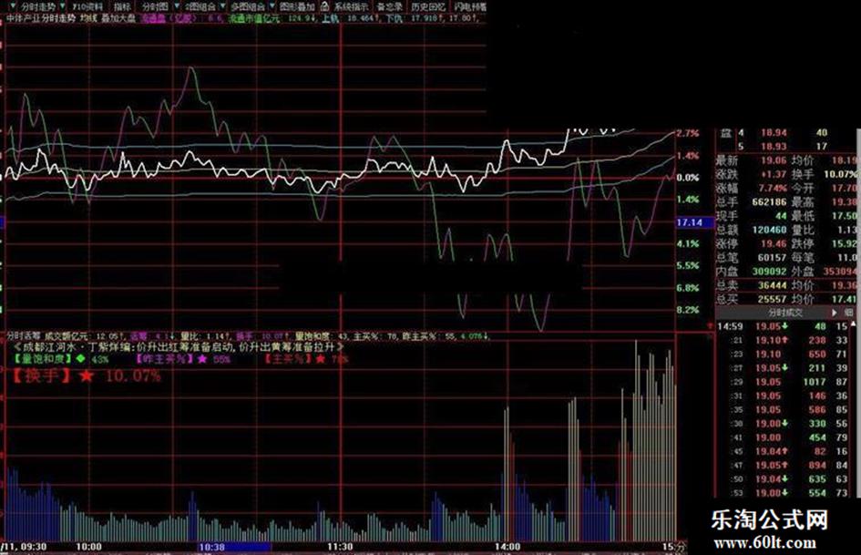 该指标是对股票当天能量的预测以及与前一天成交量的对比。为了方便区分分时图中成交量的量能的级别,我们把活筹(分时成交量)分为了六种不同的颜色:地量为白色为昨天此时成交量的0.3以下,浅兰色为昨天此刻量的0.3-1之间,即我们所说的低换手低于昨天的分钟均量,对这样的股票,您可以先不考虑;然后是蓝色,昨天此刻量的1-2倍,表示今天的量能大致与昨日持平稍多;接下来是红色,昨天此刻量的2-3,该颜色表示今日的量能具有启动的可能,也就是说当活筹换手达到红色区域时,开始放量了,如是上涨时出的,我们才可以考虑买入;而黄色,昨天此刻量的3-6.5倍,为明显放量,若股价在上升时出现黄色,表示股票已具备了拉升条件;最后是紫色,昨天此刻量的6.5倍以上,表示超大换手,达到该区域的量能具备双刃剑的效果,有些股票可能放量见顶,也有些股票可能在巨量推动之下接连拉上涨停。