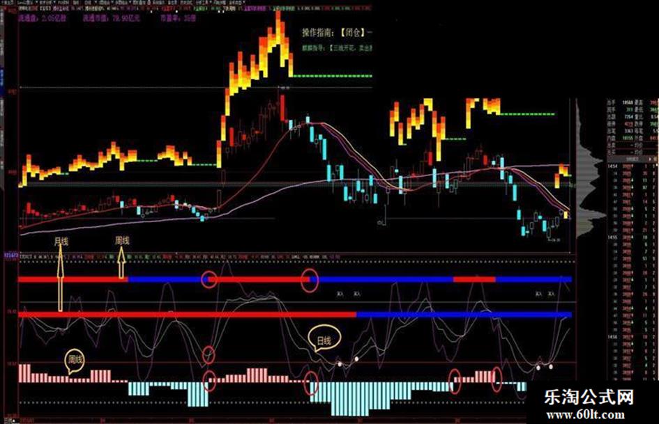 (2)第2根横条是月线级别的KDJ情况,红色表示大级别的反弹或反转,一般是反转的行情,蓝色表示大级别的回调或反转,一般是行情反转,对于做长线来讲,看月线指标。