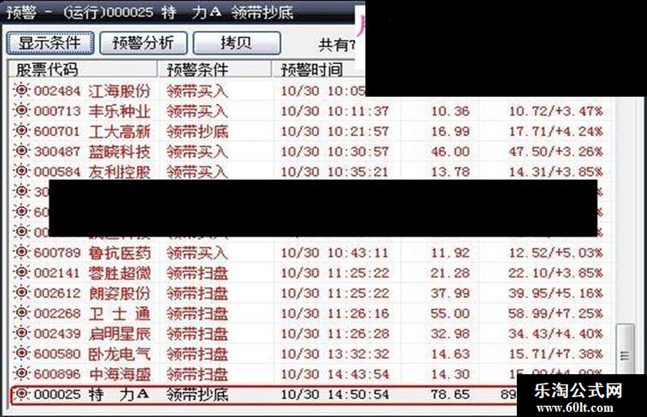 《领带抄底》是一个预警指标,是对付妖股的不错预警指标,今天特力A下调9%点多,尾盘迅速拉涨近5%,预警就这么轻松捕捉妖股的行踪。该指标加密无时限,永久使用。主要是看到拿了指标就走的人太多,缺乏对写指标者的起码尊重,没必要给这些人源码。顶不顶没关系,重在坛友之间的相互尊重。
