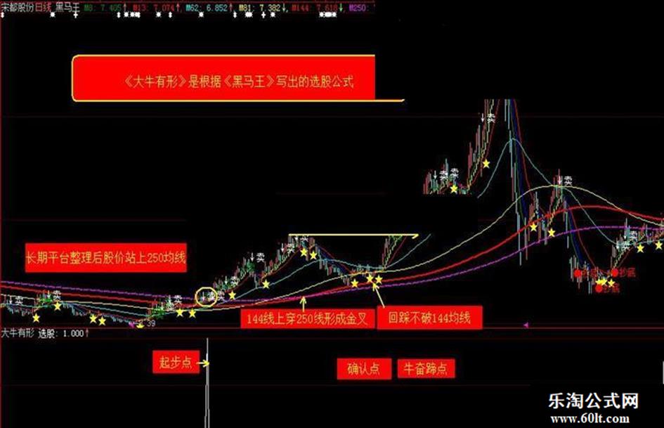 《大牛有形》是根据《黑马王》主图写成的指标,要想成为大牛需要具备三个条件:一是长期低点平台整理出现牛起步信号;二是股价分别站上250和144均线,且144线上穿250均线形成金叉,股价回踩不破144均线;三是突破左峰平台,牛就要奋蹄了。加密无时限,无未来,不喜请绕行。