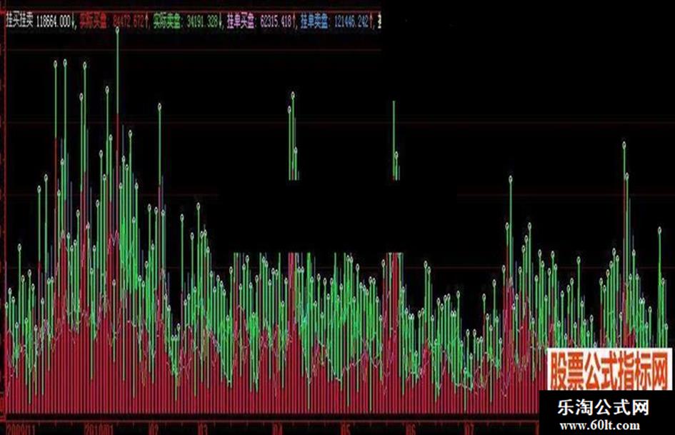 实际卖盘:IF(CLOSE>OPEN,AA*((HIGH-CLOSE)+(OPEN-LOW)),IF(CLOSE<OPEN,AA*(HIGH-LOW),VOL/2)),Color00F800, LINETHICK1;