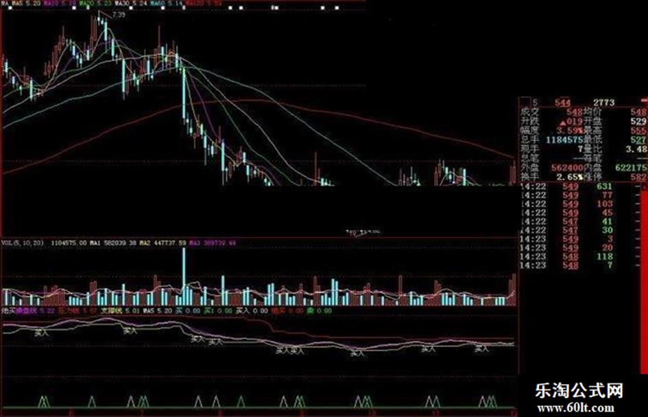 买:CROSS(k,-0.01) ,colorffff00;A0:=LLV(SUM( EMA((C+L)/2,2),5)/10.158,10);