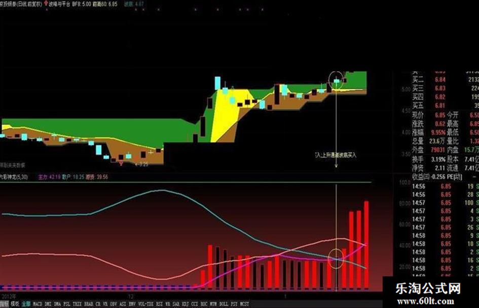 DRAWTEXT_FIX(1,0.5,0.9,0,'用法:股价上穿黄色波峰买入;股价突破有5天以上的绿色平台买入;上升通道波底买入'),COLORYELLOW;