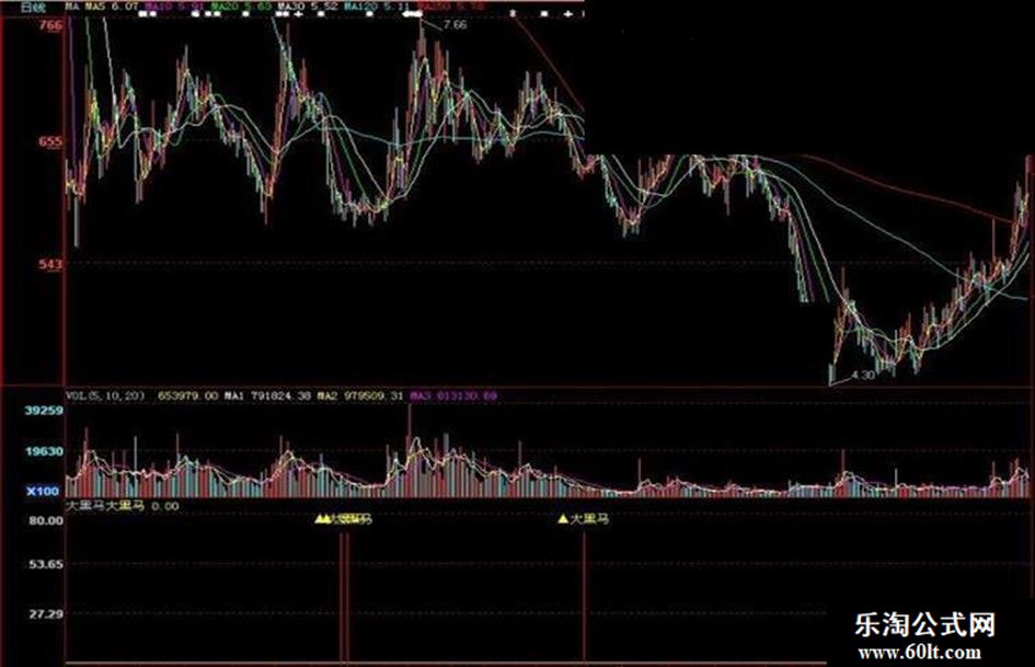 DRAWTEXT(CROSS(趋势线,0)AND 黑马线<40,80,'▲大黑马'),COLORYELLOW;