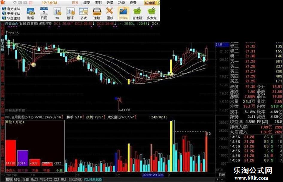 卖盘:=IF(CLOSE>OPEN,0-AA*((HIGH-CLOSE)+(OPEN-LOW)),IF(CLOSE<OPEN,0-AA*(HIGH-LOW),0-VOL /2));