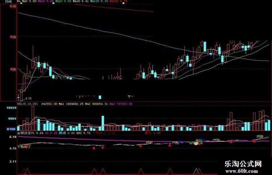 1.指标中红色箭头和笑脸金鼠送宝均是买进信号。当发出买进信号时,如果在牛市里,只要V1线上穿BBI线(黄线上穿白线)可大胆买进;如果在熊市里发出买进信号时,最好是股价上穿V2线(粉色线)时跟进较安全。在股价下跌中出现买进信号不建议操作。