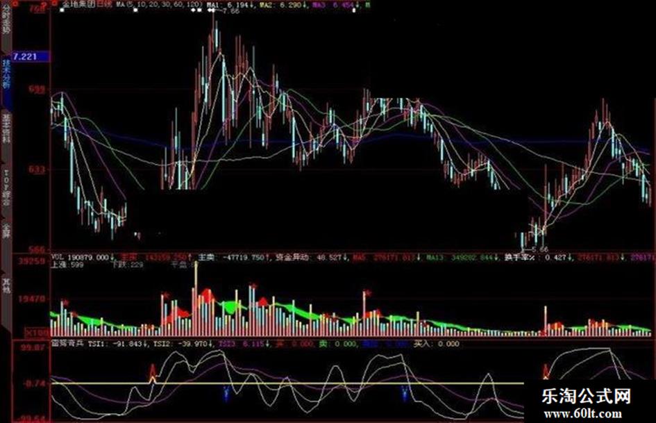卖出:IF(CROSS(TSI2,TSI1)and TSI1>50 ,-50,0),linethick2,colorff0000;