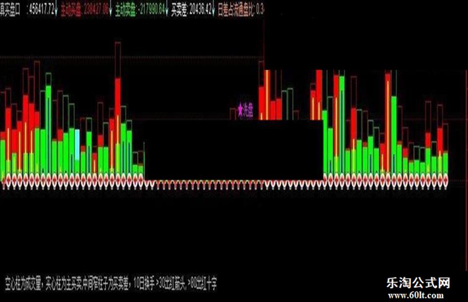 DRAWTEXT_FIX(1,0.01,0.9,0,'空心柱为成交量,实心柱为主买卖,中间窄柱子为买卖差,10日换手 >30出红箭头, >80出红十字'),COLORLIGRAY;