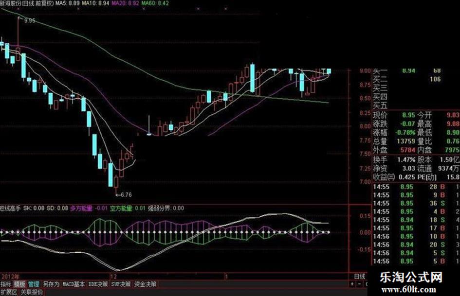 1、买点:当“多方能量”紫线上翘、“空方能量”绿线下勾时买入;当“多方能量”紫线向上与“空方能量”绿线“金叉”或SK与SD金叉时为较佳的买点。