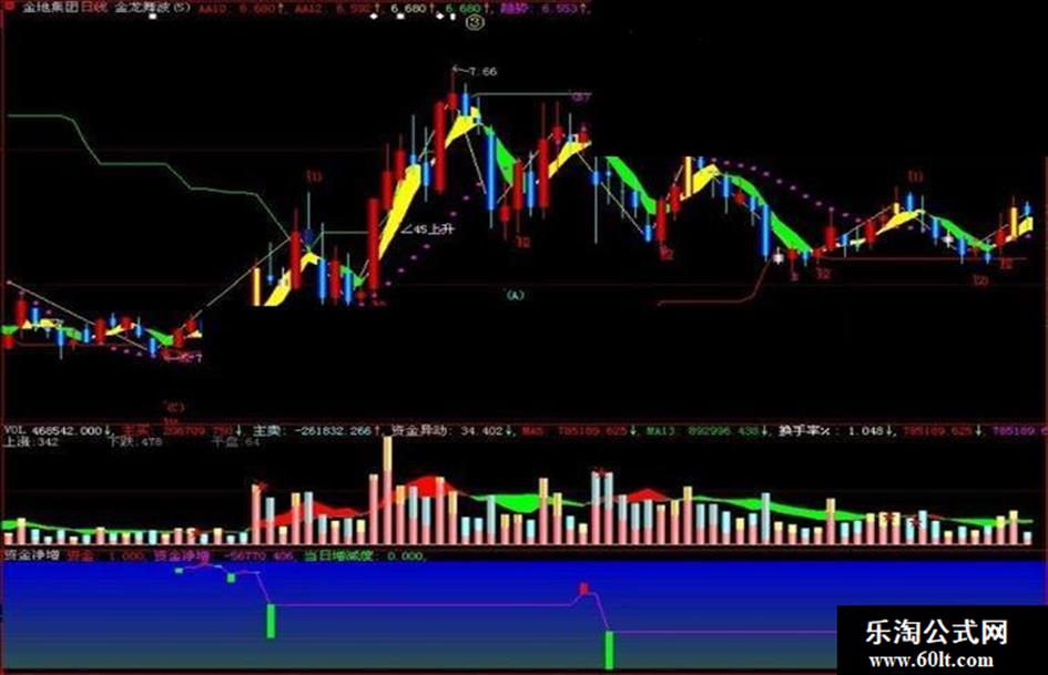 STICKLine(DT<0,资金净增+DT,资金净增,5,0),COLORGreen;