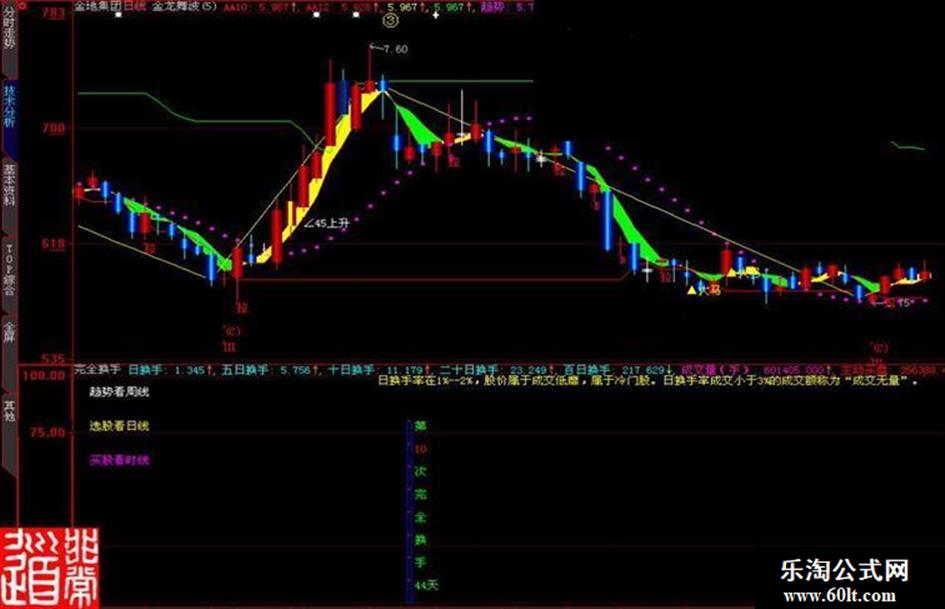 IF HSL>5 AND HSL<8 THEN BEGIN DRAWTEXT(c>0 and DISPSTATUS=2,100-(sss*i),' 日换手率在5%--8%, 大于7%,常常超过10%,属于股价成交带量,表明筹码在急剧换手。发生在低位或是通过第一阻力区,很可能是强庄积极进货。'),Color00FFFF,ALIGN2;