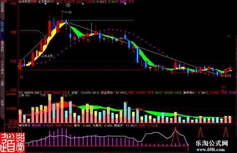 黑马线: IF(VAR7>0.1,VAR8,0)*5,STICK ,LINETHICK3,colorff00ff;{008364 ;}