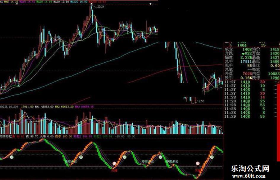 DRAWTEXT(cross(涨,跌) and 跌<20 and 跌>-10,40,'停雨多云'),colorccff99;