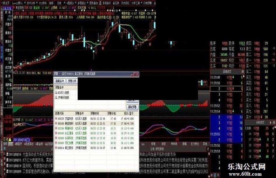 今日中午编制完成加入预警立即就有股票报警,下图前两个图是黄金线买点(主图上K线下有红色向上箭头),后一个图是KDJ共振买点(KDJ共振副图有红色向上箭头)预报结果。一般KDJ共振买点先于黄金线,激进者可按KDJ共振买点买入股票,稳健者可按黄金线买点买入股票。仅供参考。下载后望回复,使用后认为好的请推荐。