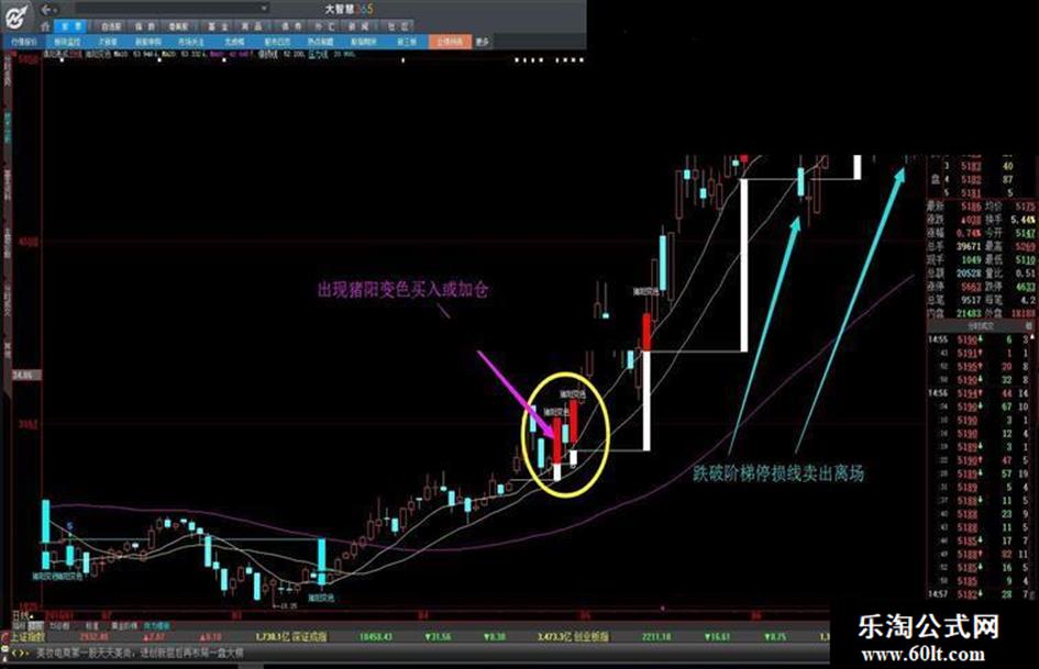 跟上次给大家分享的带有四个参数的“黄金阶梯”指标相比,“猪阳变色”指标因为引入了个股本身三条重要均线的碰撞,所以,红色K线的“猪阳变色”往往出现在一波上涨后回踩重要均线之后的再次拉起,底分型确立时的比较确切的买入点,这和“缠论”的二买位或三买位不谋而合,而停损的设置一般也就是那根比较重要的“猪阳变色”K线的震幅(10%~15%),并且随着股价的盘升,指标可以自动把停损移动到下一次“猪阳变色”K线的最低价,形成相对合理的移动阶梯出场策略,适合偏中线的持股用户选择使用。如果持股周期偏短,则可以使用“黄金阶梯”指标的参数1或参数2方案作为停损。