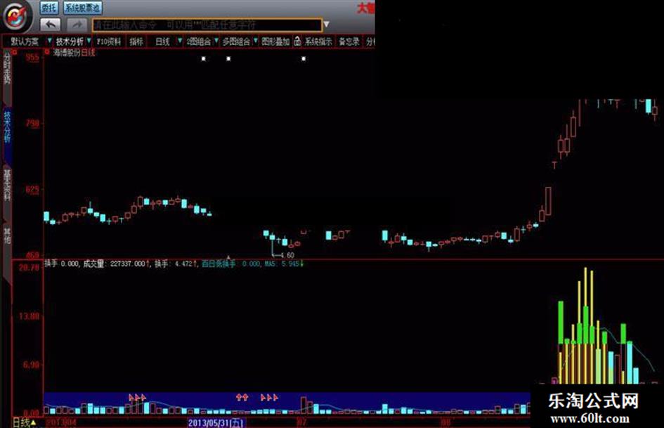 DRAWICON(拉升/REF(拉升,1)>5 AND REF(拉升,1)/REF(拉升,2)>5,换手/3,1),LAYER1;