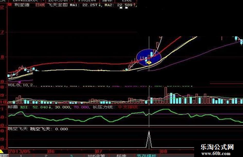 MA1:=MA(CLOSE,3); MA2:=MA(CLOSE,20); MA3:=MA(CLOSE,46); 飞天:=MA(CLOSE,25)+MA(CLOSE,25)*20/100; 跳空飞天:REF(CLOSE,1)<飞天 AND O>飞天 AND CROSS(MA1 ,飞天);
