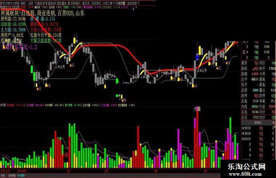 1.在每天的成交量柱上用不同的色柱分类显示机构、大户、中户和散户的净买入量。每天的量柱上最多只会出现三种颜色,因为至少有一家是净卖出的。机构为大红色柱,大户为玖瑰红色柱,中户为黄色柱,散户为绿色柱。