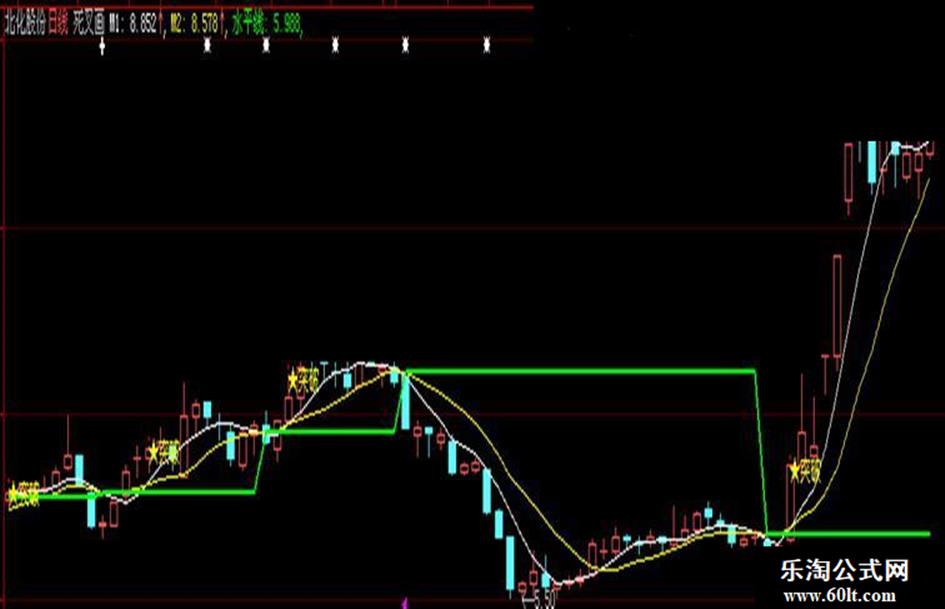 水平线:IF(CROSS(M2,M1),M2,REF(M2,BARSLAST(CROSS(M2,M1)))),LINETHICK2,COLORGREEN;