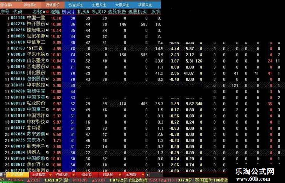 专业版本除一般版本的所有功能外,还为使用者提供了自行定义大单的功能,自行设定固定显示交易日某个时间点的占比排序情况,自行设定攻击强度的排序阈值。专业版使用者还可通过设定不同大单阈值N来在同一页面显示不同大单在全天任何时间点的占比排序情况,据而对实时交易市场个股资金的流入细节了若指掌。以下是一般版本的排序图,有人要求我把排序图中的辅助排序项“开涨”(即开盘涨幅)也发出来,其实,它就是一个自9:25显示开盘涨幅的很简单的辅助排序指标,使用者可自行编写,也可点击以下链接下载使用(排序时的分析周期为分笔):