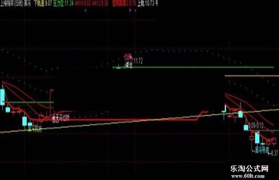 {DRAWTEXT(((((((CROSS(黑马趋势,短期底部) AND ((RL5 - REF(RL5,1)) > 0)) AND ((黑马趋势 - REF(黑马趋势,1)) > 0)) AND (黑马趋势 > 1)) AND (LOW <= 支撑位)) AND (CLOSE > 支撑位)) AND (HIGH < 压力位)),(LOW - 0.15),'←黑马发现'),COLOR00FFFF;