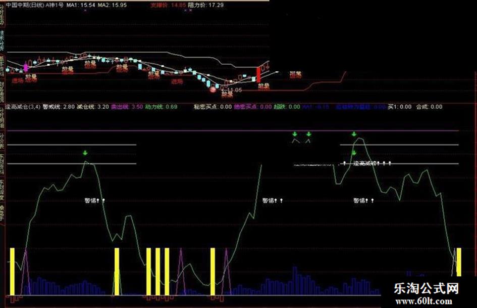DRAWTEXT(CROSS(动力线,减仓线),2.8,'逢高减磅!!! '), ,;