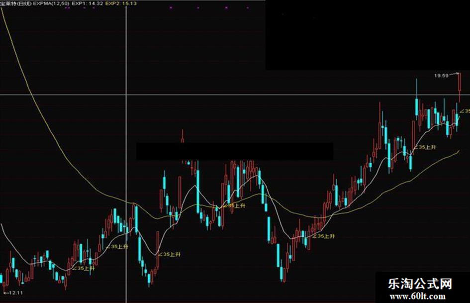 BB13:=ATAN(EMA(X1,13)-REF(EMA(X1,13),1))*3.1416*10; EMA8:=EMA(C,8); DRAWTEXT(FILTER(BB13>1 AND EMA(X1,13)>REF(EMA(X1,8),1),10), EMA8,'∠35上升'),COLORYELLOW;