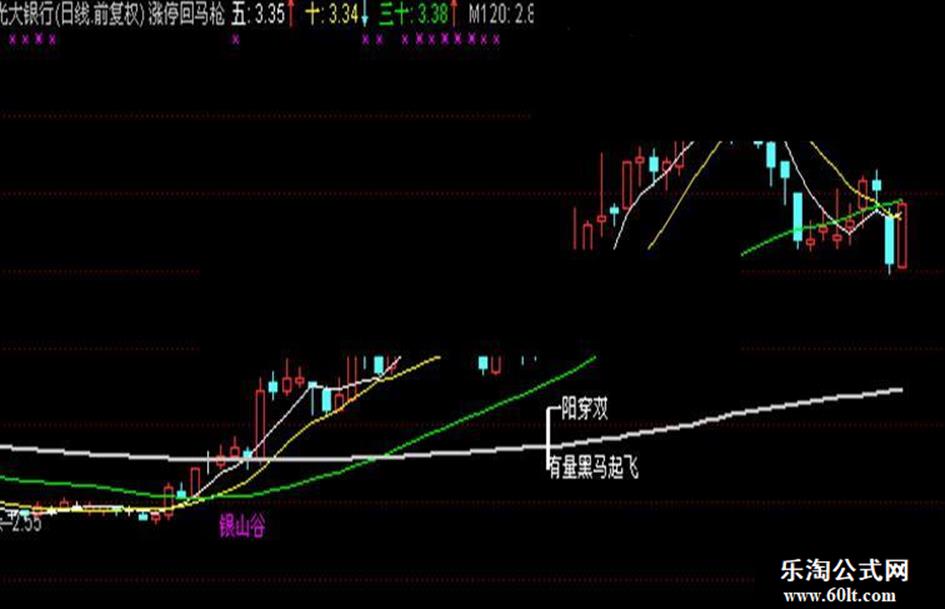 STICKLINE(涨停,OPEN,CLOSE,3.8,0),COLORMAGENTA; {K线实体部分画洋红色,宽度为2,画实线实心柱}